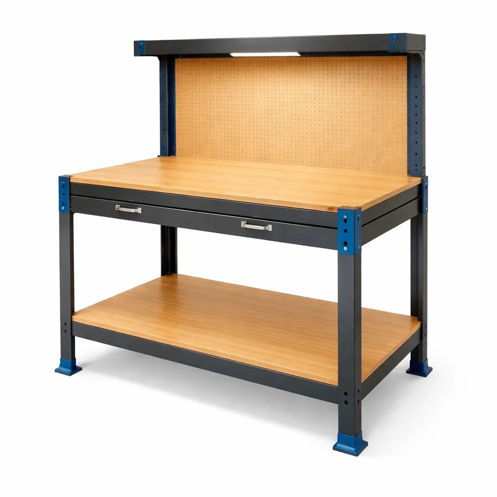 Materiale: Struttura in metallo, piano e ripiani in legno MDF, pannello forato in legno MDF.