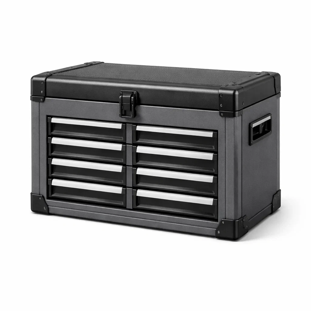 Questa cassettiera portautensili è realizzata in acciaio resistente alla corrosione. Include 8 cassetti con maniglie in metallo e presenta un design compatto con chiusura di sicurezza.