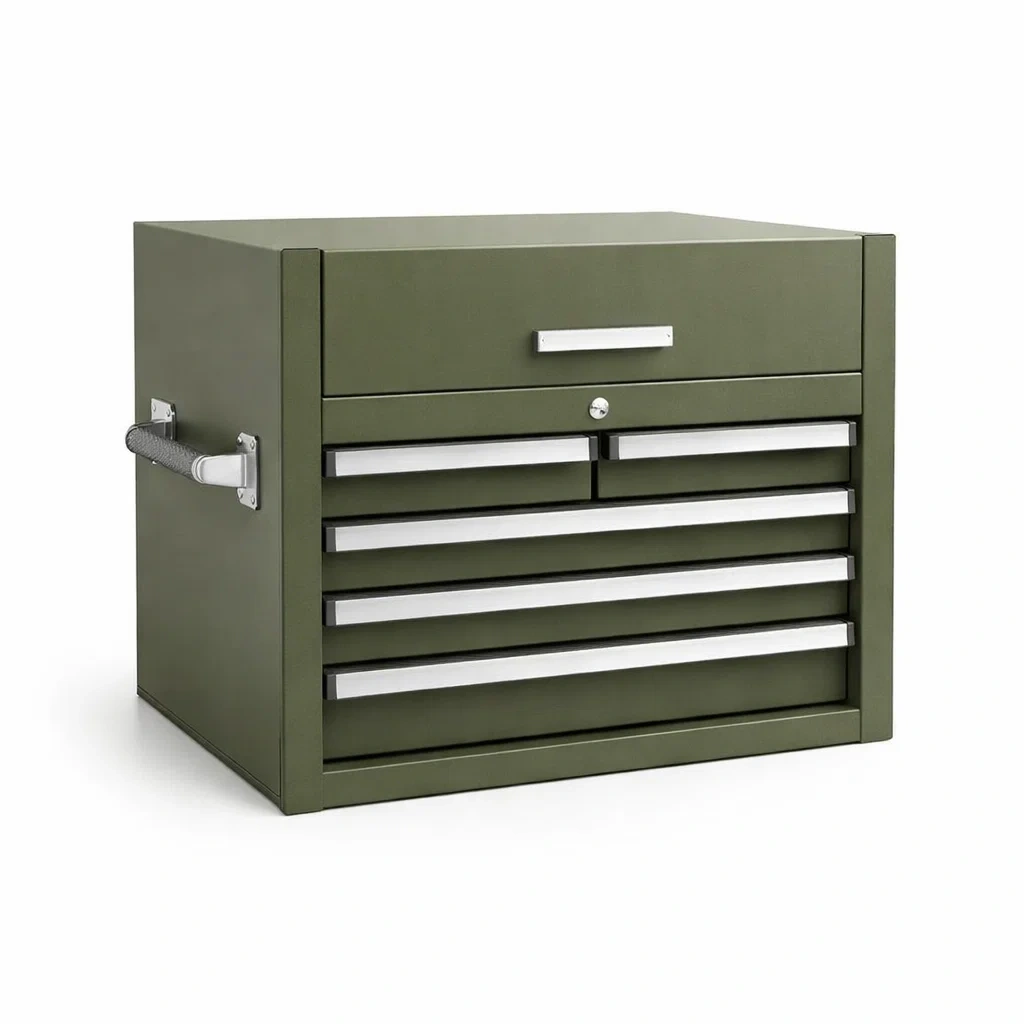 Dispone di 6 cassetti con sistema di scorrimento meccanico per la conservazione degli attrezzi manuali. La cassettiera offre alta resistenza strutturale, una superficie antigraffio e una verniciatura protettiva contro la ruggine.