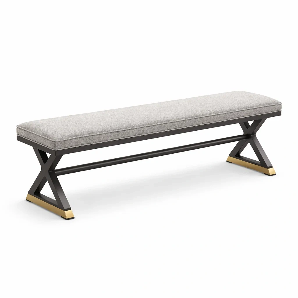Questa panca presenta un telaio in acciaio verniciato a polvere con supporto a X rinforzato da angoli in metallo. Il sedile è imbottito con schiuma poliuretanica e rivestito in tessuto di poliestere grigio. Le dimensioni sono 120 cm di lunghezza, 40 cm di larghezza e 45 cm di altezza. Il peso totale è di 15 kg.