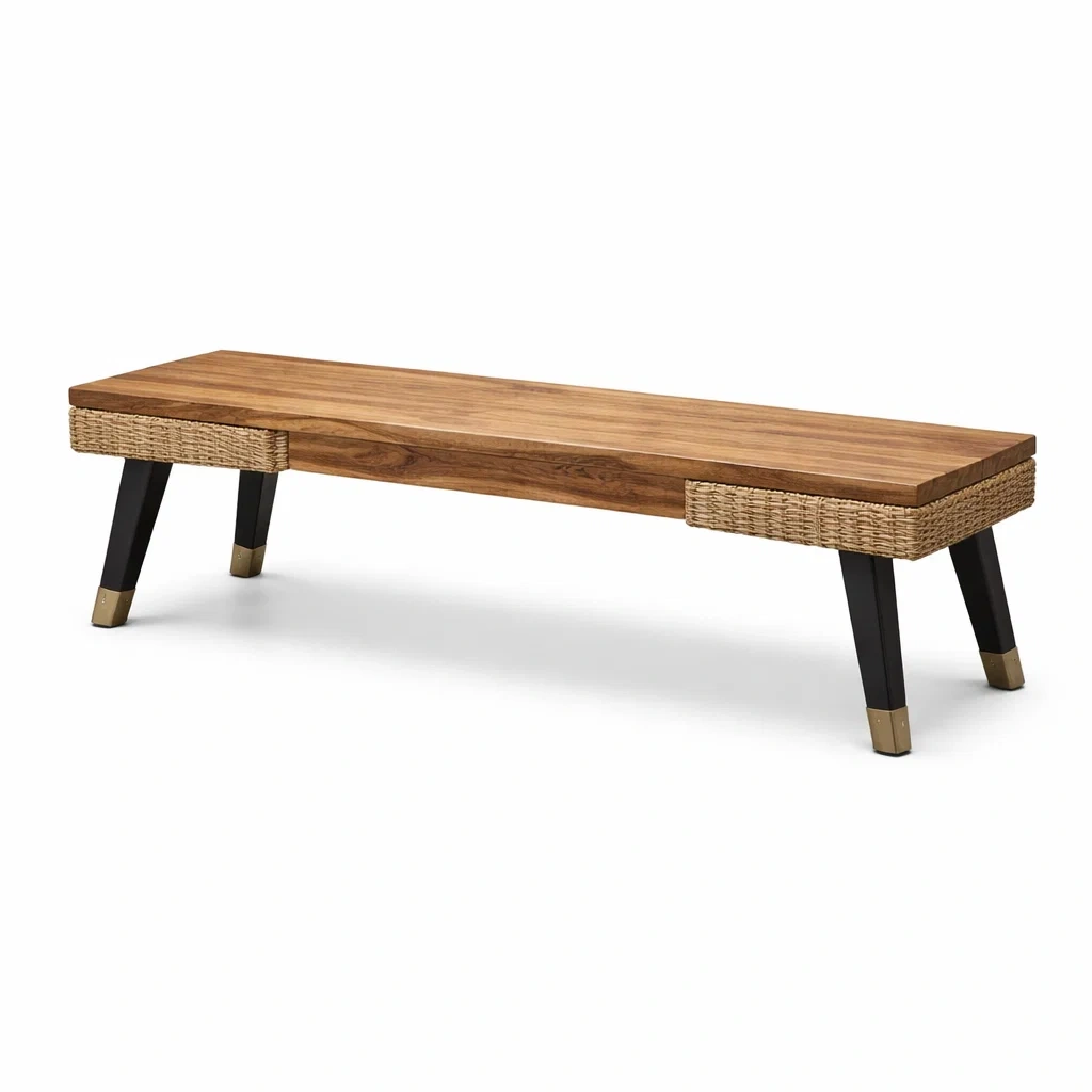 Questa panca presenta una struttura in legno massello con dettagli in rattan intorno ai bordi. Le gambe sono in metallo con punte decorative dorate, fornendo stabilita e uno stile distinto. La lunghezza della panca è di 160 cm, la larghezza è di 45 cm e l'altezza è di 35 cm.