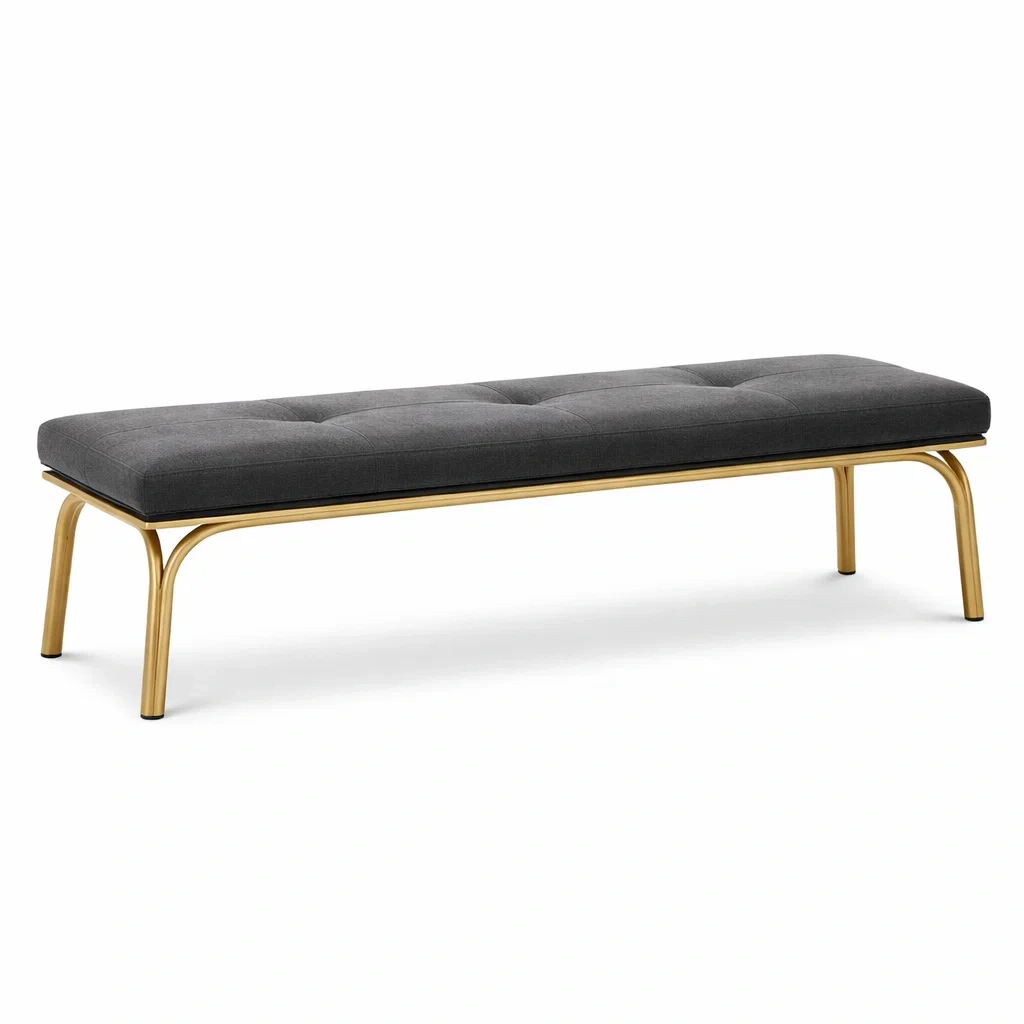 La panca ha una seduta imbottita in tessuto poliestere grigio sostenuta da una struttura in metallo dorato. Misura 160 cm di lunghezza, 40 cm di larghezza e 45 cm di altezza. Capacità di carico massima: 150 kg.