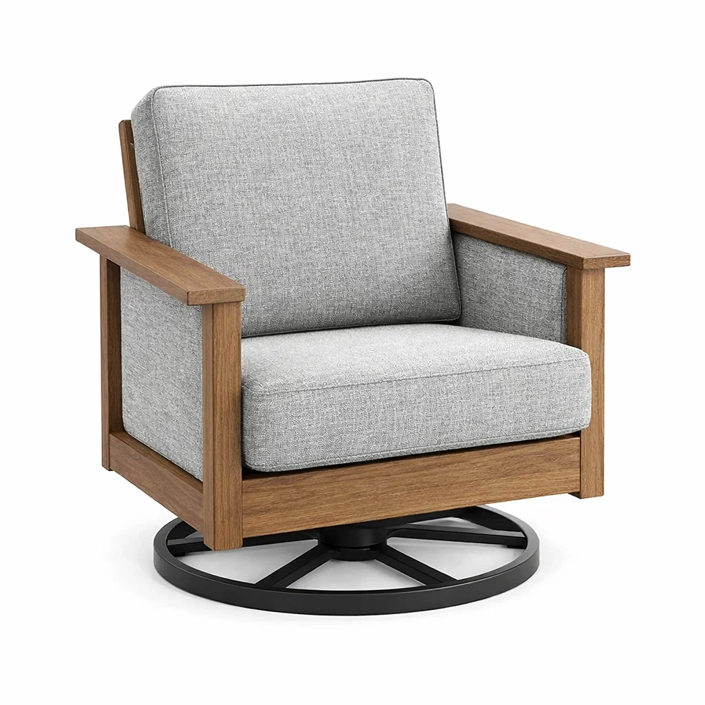 Dimensioni: Lunghezza 80 cm, Larghezza 75 cm, Altezza 90 cm. La poltrona ha una funzione girevole a 360 gradi ed è progettata per uso interno. Peso massimo supportato: 120 kg.