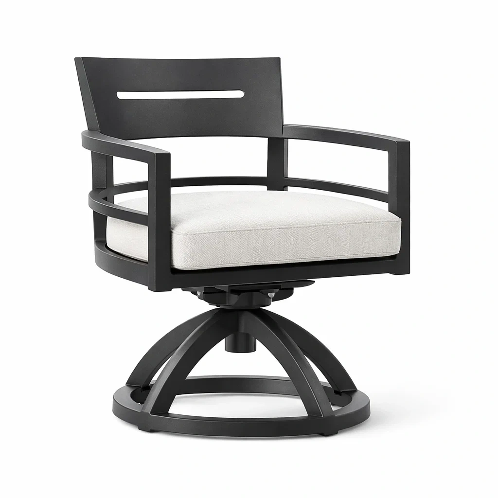 La sedia è composta da una struttura in metallo resistente e un cuscino in tessuto di poliestere. La base girevole consente una rotazione di 360 gradi. Altezza fissa. La sedia ha un peso di 8.50 kg e dimensioni di 80 cm di altezza, 50 cm di larghezza e 45 cm di profondità. Capacità di carico fino a 120 kg.