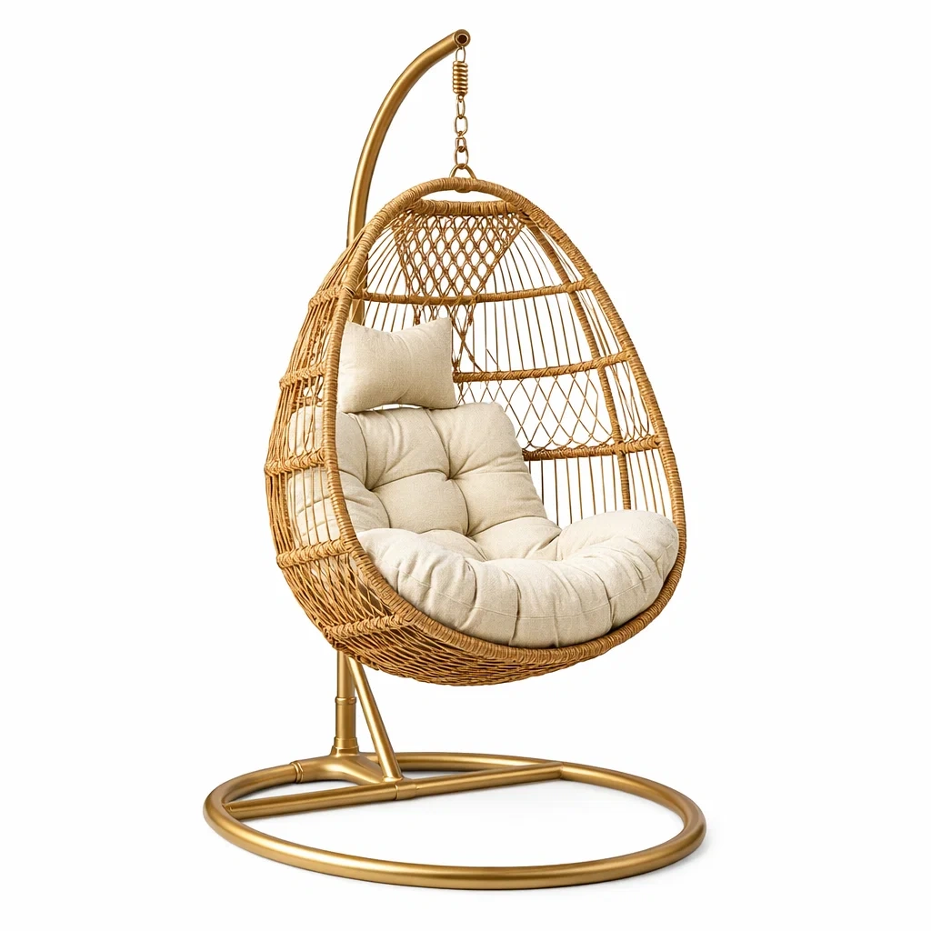 Poltrona sospesa a uovo in Rattan Sintetico e Acciaio con Cuscino Beige